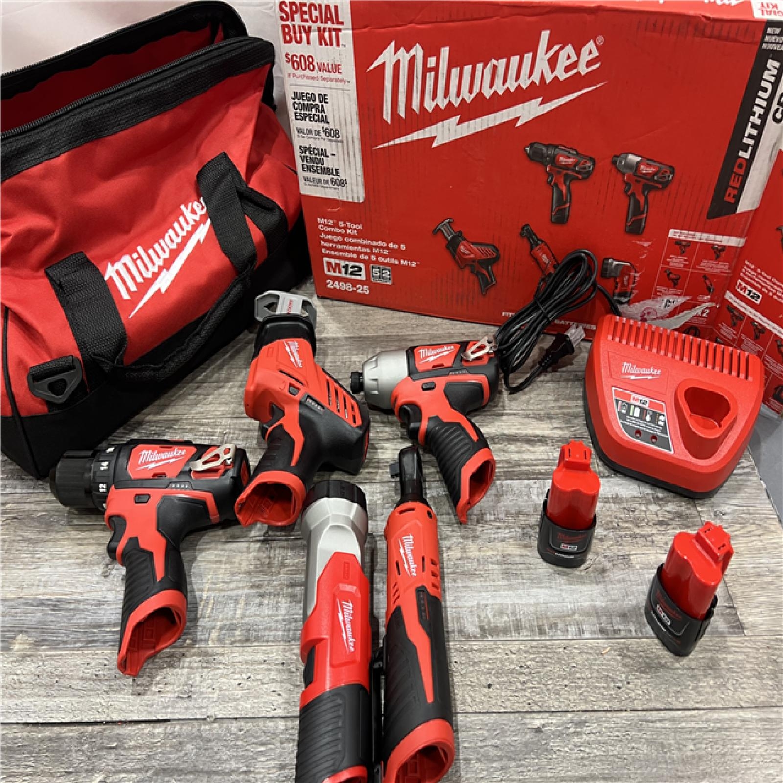 AS IS MILWAUKEE M12 12V Lithium Ion Cordless Combo Kit 5 Tool With Two 1 5Ah Batteries Charger Tool Bag