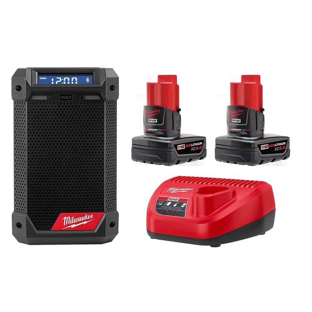Milwaukee Electric Tool Brandclub M12 12 Volt Lithium Ion Cordless Bluetooth AM FM Jobsite Radio With Charger With Two M12 6 0 Ah Battery Packs Charger