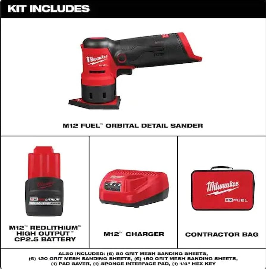 Equipped with a long-lasting Milwaukee M12 battery, this sander offers extended run time and consistent power output. The kit also includes various sanding pads and accessories to help you achieve professional results on every project.